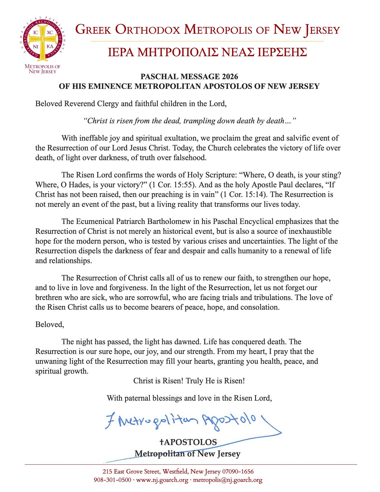 Paschal Message of His Eminence Metropolitan Apostolos of New Jersey