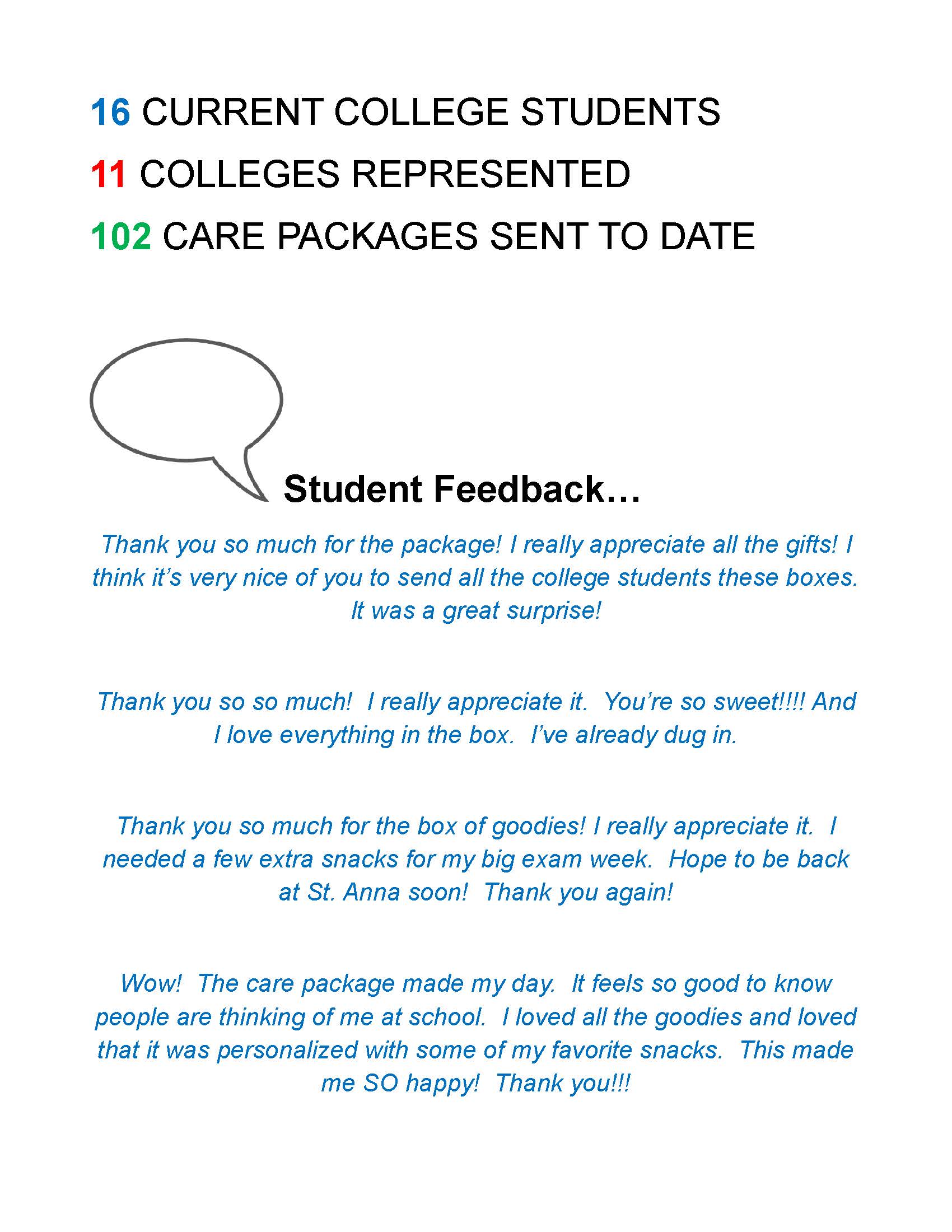 As our young adults go off to college—whether it’s close to home or far away— it is important that they stay connected to their St. Anna family. Our College Care Package Ministry aims to establish and maintain contact with each of our high school graduates as they progress through their college years. Our goal is to remind them that church is always HOME.